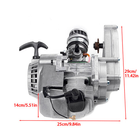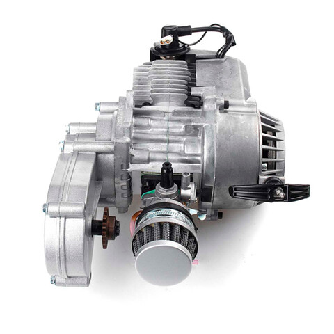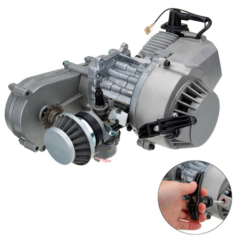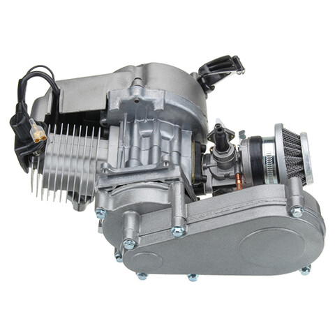 Двигатель на детский бензиновый квадроцикл MOTAX ATV Grizlik 50 mini. Рабочий объем 49 кубов, двухтактный, запуск ручной, установлен редуктор, карбюратор, воздушный фильтр.